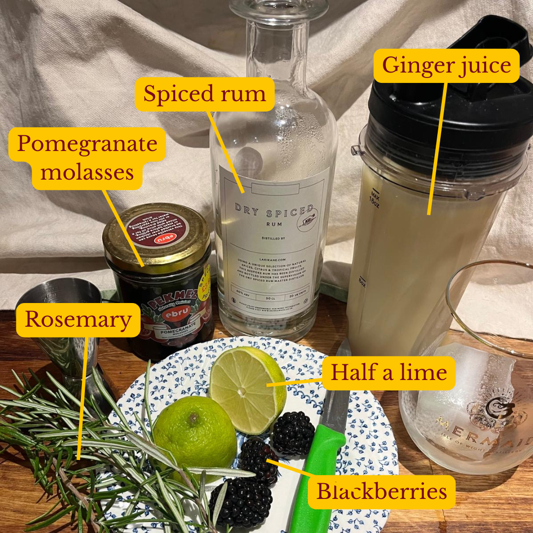 Instead of putting in pomegranate molasses, which makes it this very muddy colour, my fix for next time would be to use a shot of a red berry liqueur. Pair that with the rum, the ginger, and the lime and mix all that up in a shaker, then put over your waiting ice. Then put a dollop of blackcurrant or blackberry jam in there or even maple syrup!